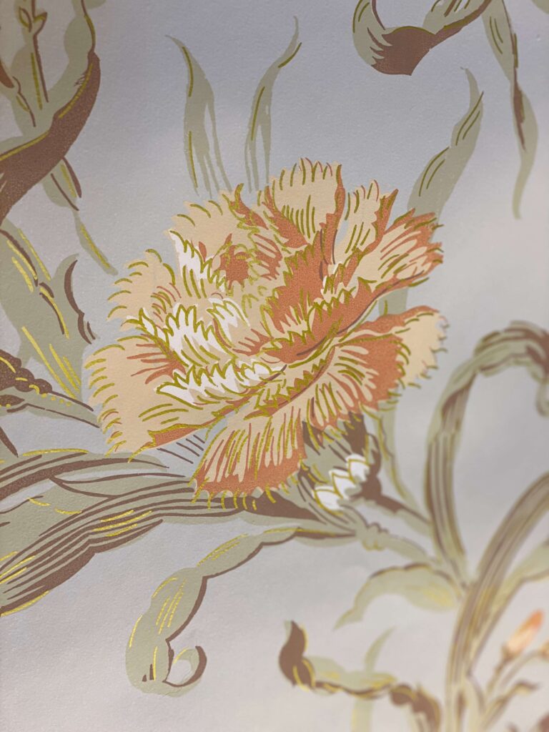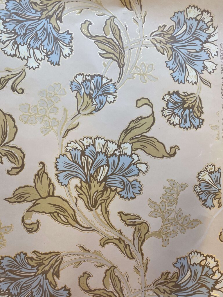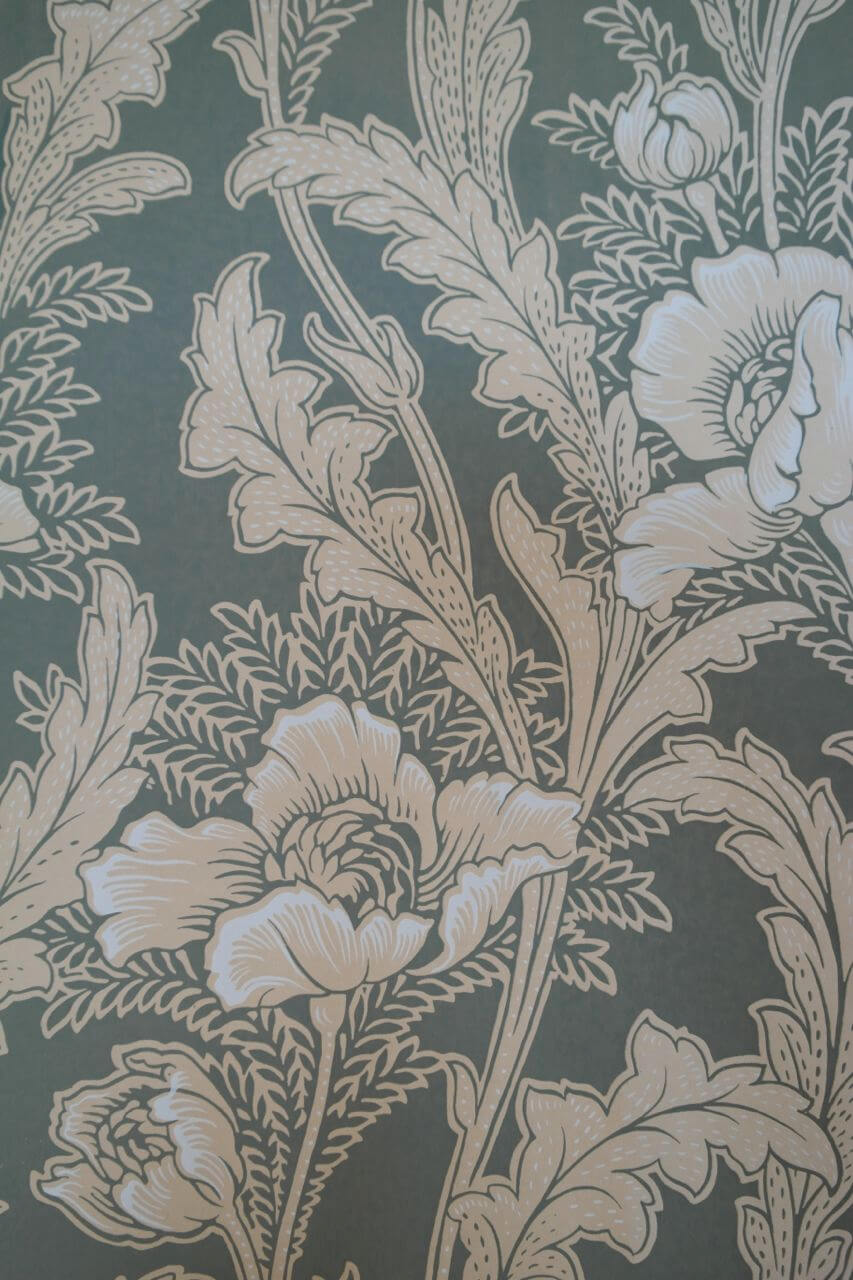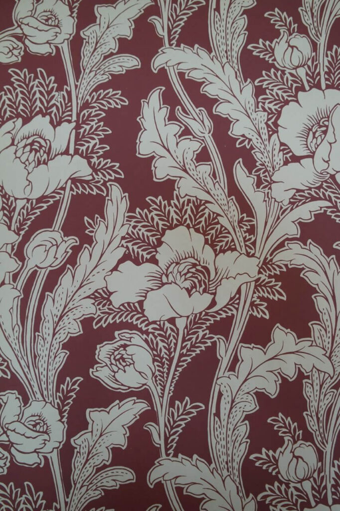 Den engelsk/franske retningen er friere og mer poetisk. Her slynger stilkene seg over veggflaten, blomster åpner seg i myke, bølgende linjer, og mønsteret lever sitt eget liv. Stripene forsvinner, og bevegelsen tar over. Fargene er lysere og mer transparente – bleke grønntoner, gyllent gult og milde blånyanser – ofte kombinert med diskrete innslag av metallisk «sølv» og «gull». Et stemningsfullt eksempel kan oppleves i Apotekergården på Maihaugen.