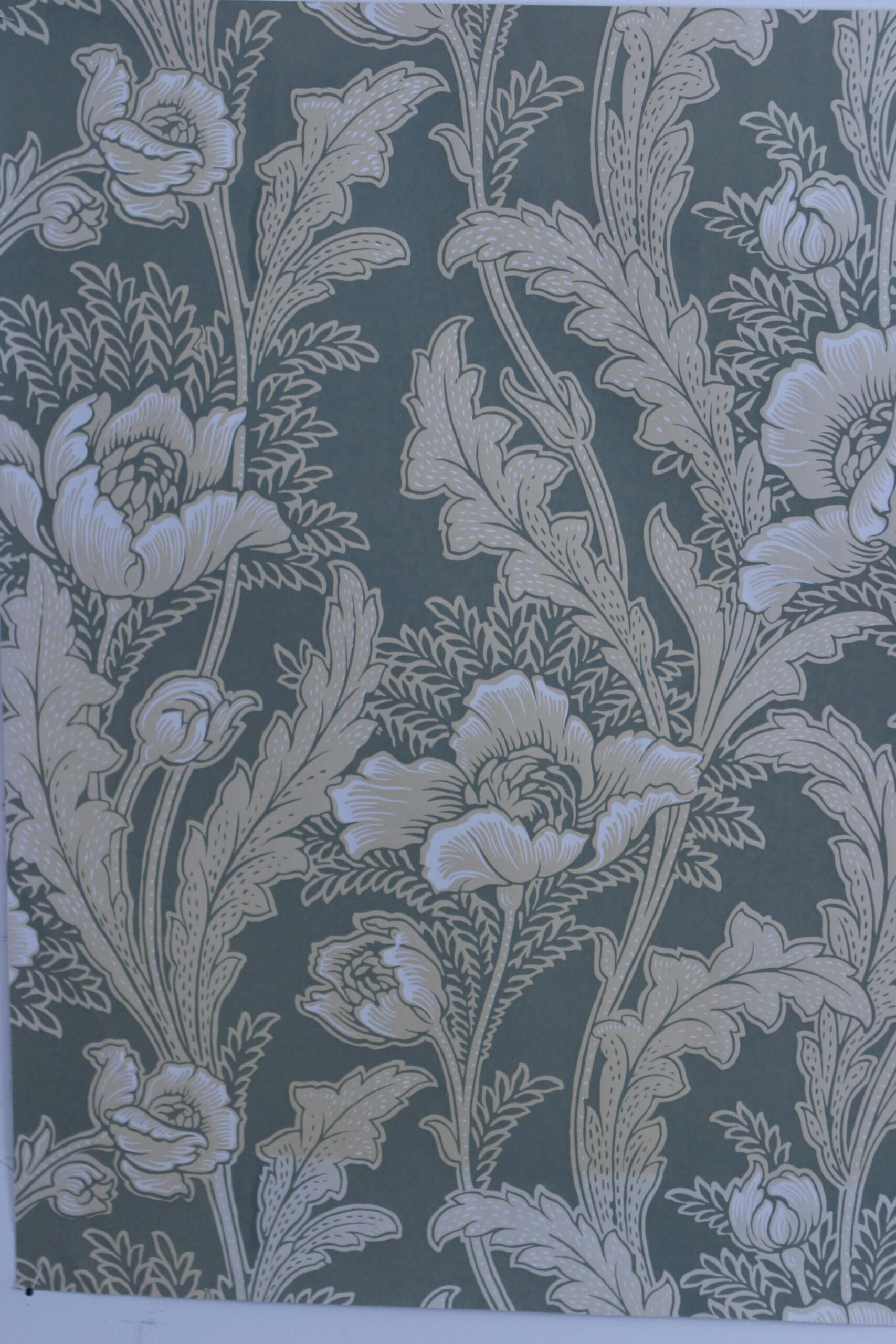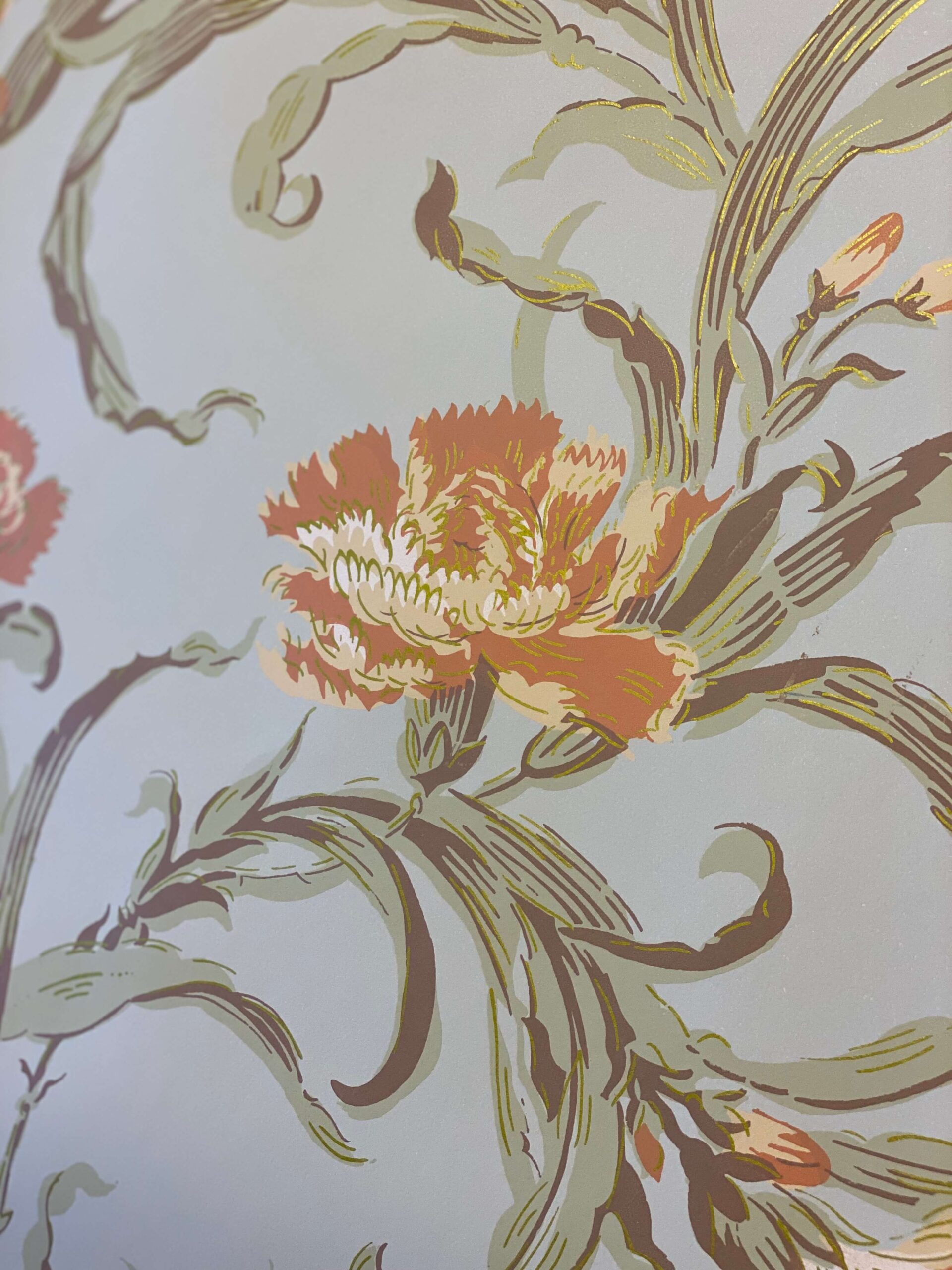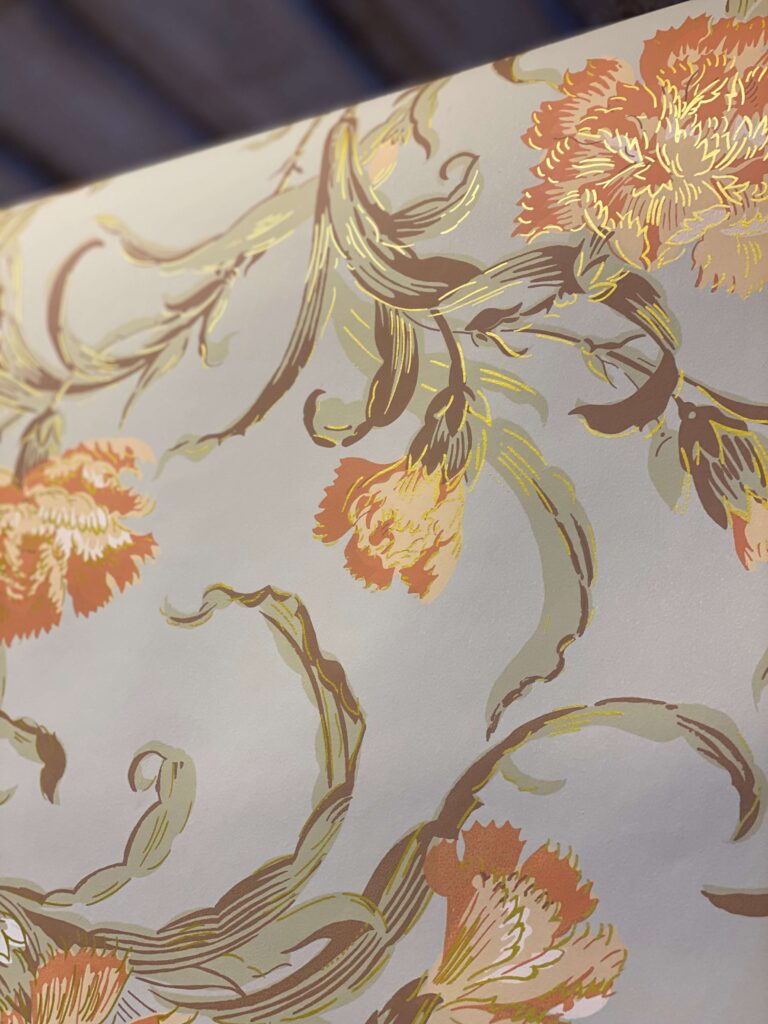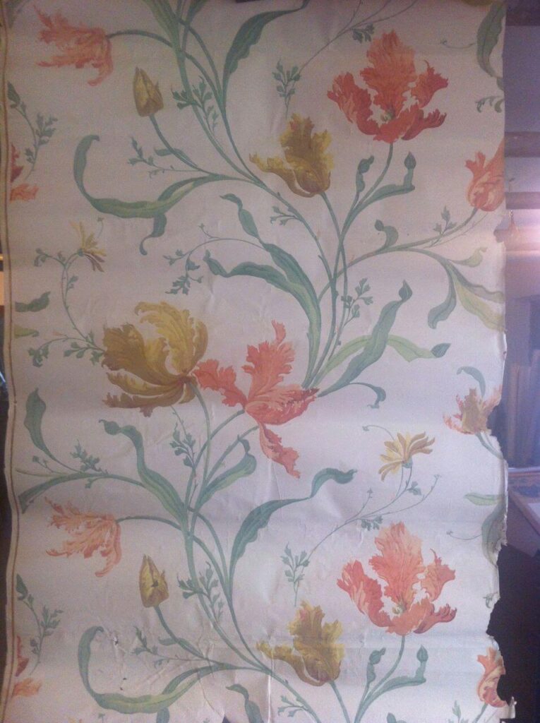 Den engelsk/franske retningen er friere og mer poetisk. Her slynger stilkene seg over veggflaten, blomster åpner seg i myke, bølgende linjer, og mønsteret lever sitt eget liv. Stripene forsvinner, og bevegelsen tar over. Fargene er lysere og mer transparente – bleke grønntoner, gyllent gult og milde blånyanser – ofte kombinert med diskrete innslag av metallisk «sølv» og «gull». Et stemningsfullt eksempel kan oppleves i Apotekergården på Maihaugen.